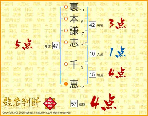 裏(13画)本(5画)謙(17画)志(7画) 千(3画)恵(12画)