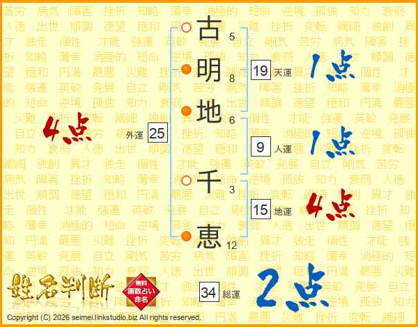 古(5画)明(8画)地(6画) 千(3画)恵(12画)