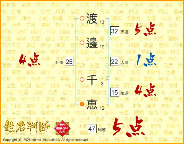 渡邊千恵さんの総運は47画の5点!