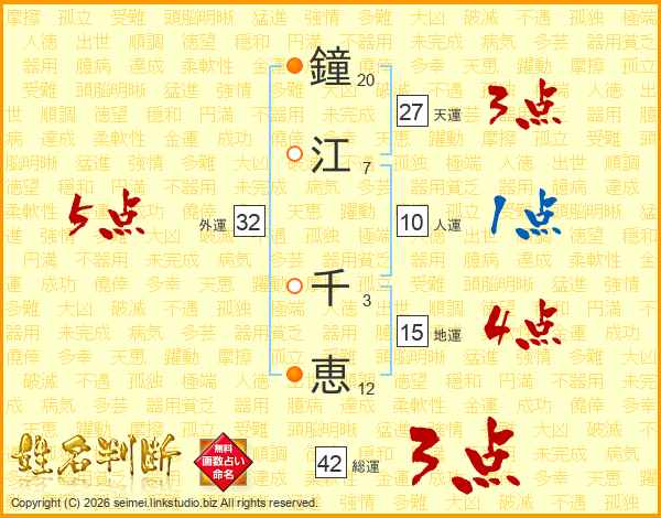 鐘(20画)江(7画) 千(3画)恵(12画)