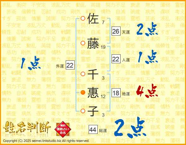 佐藤千惠子さんの総運は44画の2点!