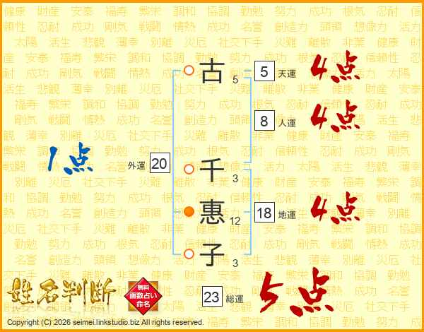 古千惠子さんの総運は23画の5点!