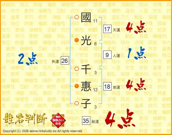 國(11画)光(6画) 千(3画)惠(12画)子(3画)