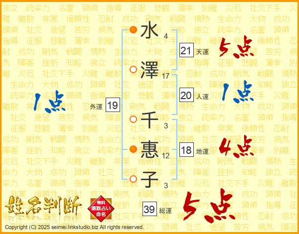 水(4画)澤(17画) 千(3画)惠(12画)子(3画)