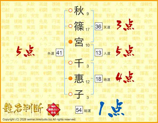 秋(9画)篠(17画)宮(10画) 千(3画)惠(12画)子(3画)