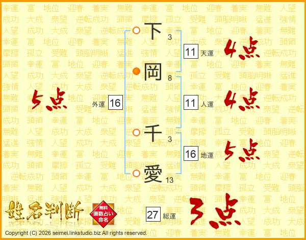 あなたの人生を表す1番重要な運勢です。生涯を通じて影響する総合運となり、主に50歳以降の晩年期に影響を及ぼします。苗字と名前の合計画数。