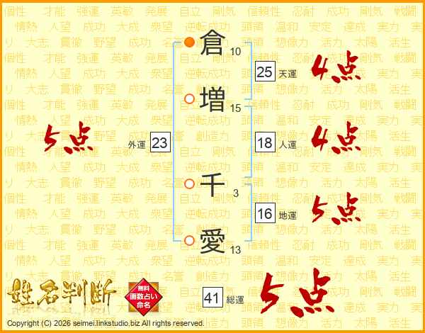 生活面を象徴する運勢です。外部から受ける影響力を表し、結婚運、家庭運や職場、環境への順応性を表します。総運から人運を引いた画数。姓や名が1文字の場合を除く。