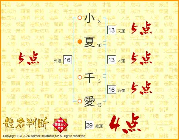 小夏千愛さんの総運は29画の4点!