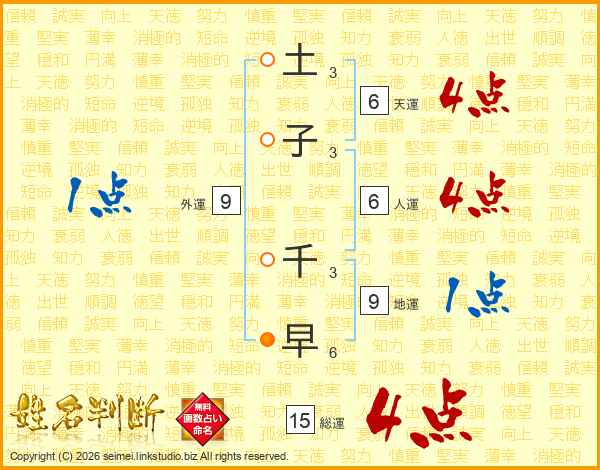 土子千早さんの総運は15画の4点!