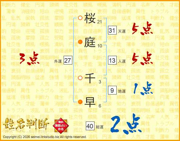 生活面を象徴する運勢です。外部から受ける影響力を表し、結婚運、家庭運や職場、環境への順応性を表します。総運から人運を引いた画数。姓や名が1文字の場合を除く。