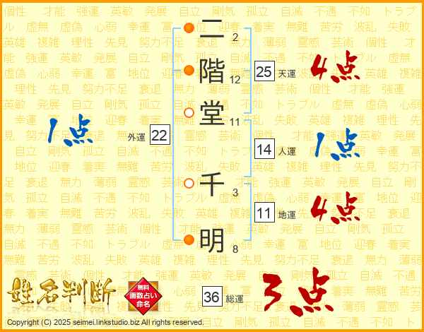 二(2画)階(12画)堂(11画) 千(3画)明(8画)