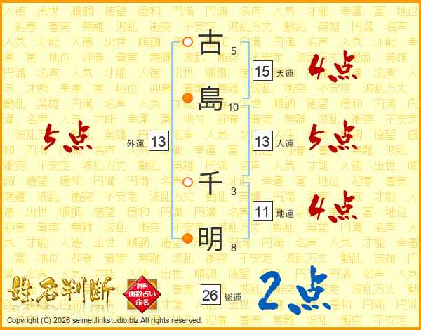 古(5画)島(10画) 千(3画)明(8画)