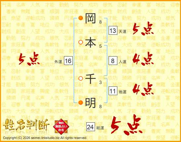 あなたの人生を表す1番重要な運勢です。生涯を通じて影響する総合運となり、主に50歳以降の晩年期に影響を及ぼします。苗字と名前の合計画数。