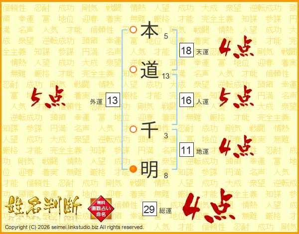 あなたの人生を表す1番重要な運勢です。生涯を通じて影響する総合運となり、主に50歳以降の晩年期に影響を及ぼします。苗字と名前の合計画数。