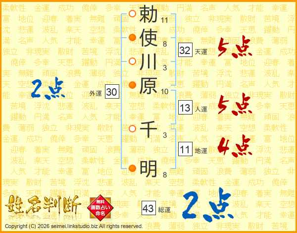 勅使川原千明さんの総運は43画の2点!