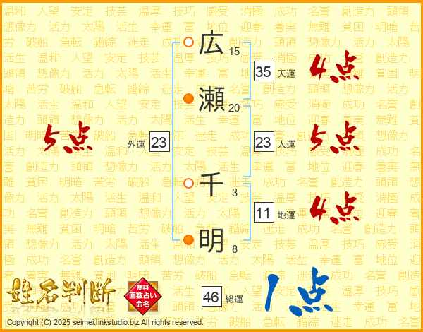 生活面を象徴する運勢です。外部から受ける影響力を表し、結婚運、家庭運や職場、環境への順応性を表します。総運から人運を引いた画数。姓や名が1文字の場合を除く。