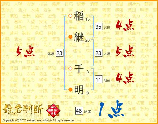 稲(15画)継(20画) 千(3画)明(8画)