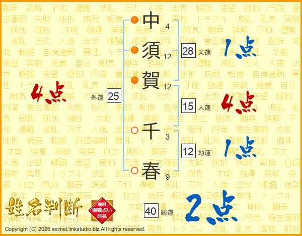 中(4画)須(12画)賀(12画) 千(3画)春(9画)