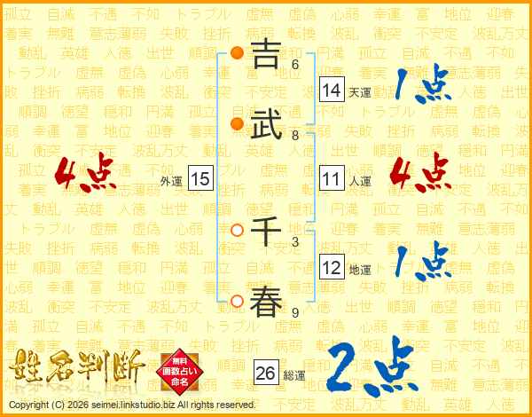 生活面を象徴する運勢です。外部から受ける影響力を表し、結婚運、家庭運や職場、環境への順応性を表します。総運から人運を引いた画数。姓や名が1文字の場合を除く。