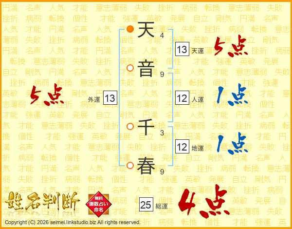 生活面を象徴する運勢です。外部から受ける影響力を表し、結婚運、家庭運や職場、環境への順応性を表します。総運から人運を引いた画数。姓や名が1文字の場合を除く。