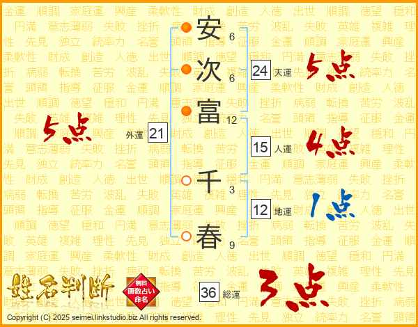 安(6画)次(6画)富(12画) 千(3画)春(9画)
