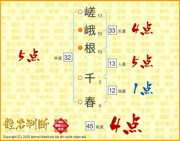 嵯(13画)峨(10画)根(10画) 千(3画)春(9画)