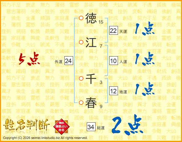 生活面を象徴する運勢です。外部から受ける影響力を表し、結婚運、家庭運や職場、環境への順応性を表します。総運から人運を引いた画数。姓や名が1文字の場合を除く。