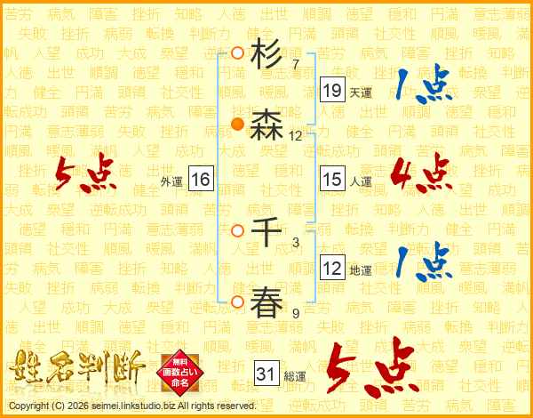 あなたの人生を表す1番重要な運勢です。生涯を通じて影響する総合運となり、主に50歳以降の晩年期に影響を及ぼします。苗字と名前の合計画数。