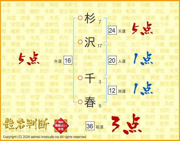 杉(7画)沢(17画) 千(3画)春(9画)