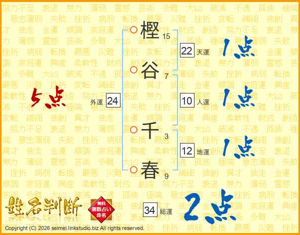 あなたの人生を表す1番重要な運勢です。生涯を通じて影響する総合運となり、主に50歳以降の晩年期に影響を及ぼします。苗字と名前の合計画数。