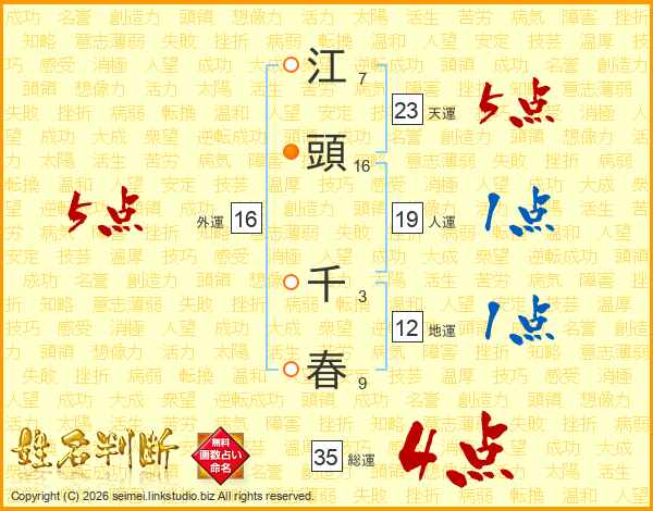 江(7画)頭(16画) 千(3画)春(9画)