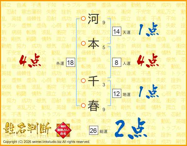 生活面を象徴する運勢です。外部から受ける影響力を表し、結婚運、家庭運や職場、環境への順応性を表します。総運から人運を引いた画数。姓や名が1文字の場合を除く。