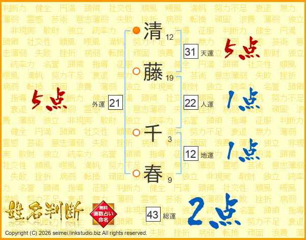 あなたの人生を表す1番重要な運勢です。生涯を通じて影響する総合運となり、主に50歳以降の晩年期に影響を及ぼします。苗字と名前の合計画数。