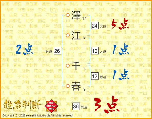 生活面を象徴する運勢です。外部から受ける影響力を表し、結婚運、家庭運や職場、環境への順応性を表します。総運から人運を引いた画数。姓や名が1文字の場合を除く。