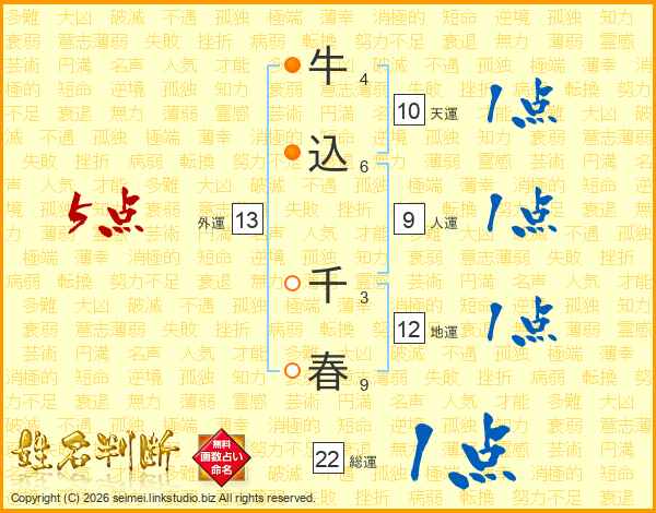 生活面を象徴する運勢です。外部から受ける影響力を表し、結婚運、家庭運や職場、環境への順応性を表します。総運から人運を引いた画数。姓や名が1文字の場合を除く。