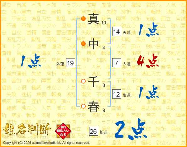 生活面を象徴する運勢です。外部から受ける影響力を表し、結婚運、家庭運や職場、環境への順応性を表します。総運から人運を引いた画数。姓や名が1文字の場合を除く。
