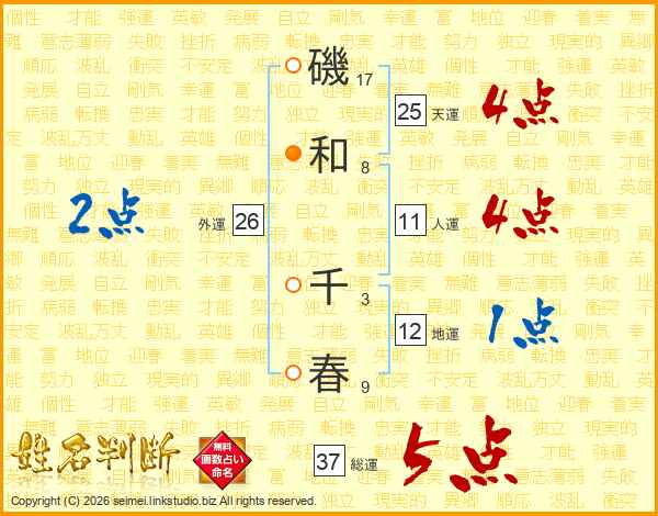 磯和千春さんの総運は37画の5点!