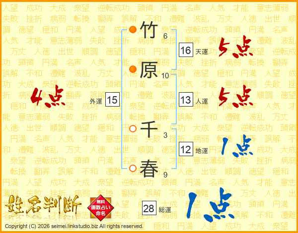 竹原千春さんの総運は28画の1点!