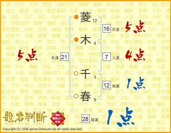 あなたの人生を表す1番重要な運勢です。生涯を通じて影響する総合運となり、主に50歳以降の晩年期に影響を及ぼします。苗字と名前の合計画数。