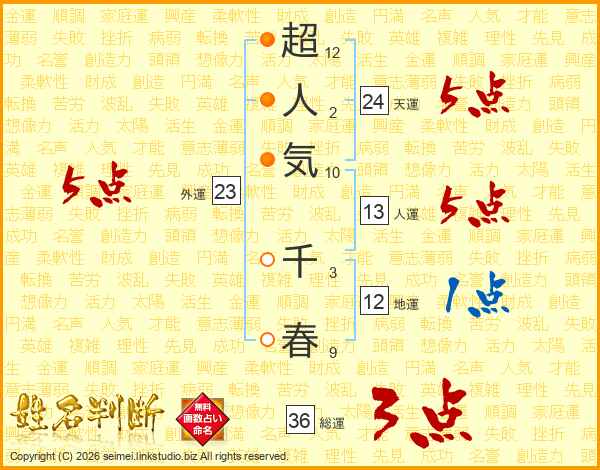 超(12画)人(2画)気(10画) 千(3画)春(9画)