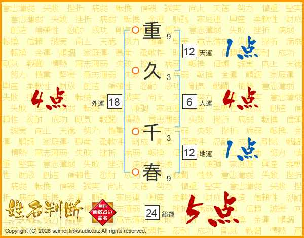 重(9画)久(3画) 千(3画)春(9画)