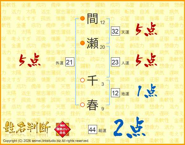 間瀬千春さんの総運は44画の2点!