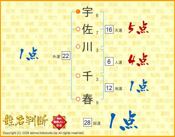 宇(6画)佐(7画)川(3画) 千(3画)春(9画)