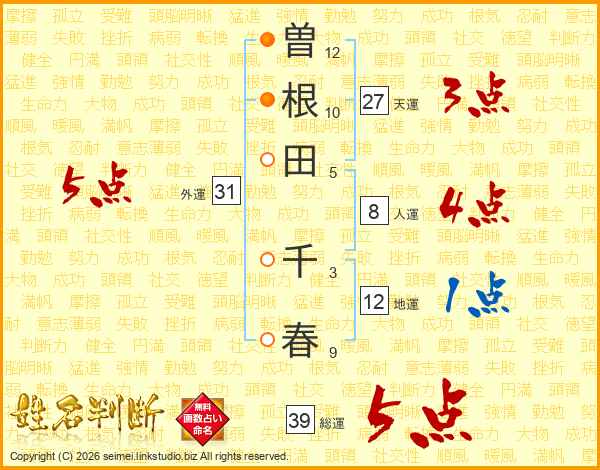 曽(12画)根(10画)田(5画) 千(3画)春(9画)