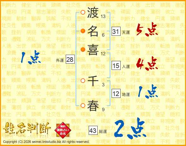 渡(13画)名(6画)喜(12画) 千(3画)春(9画)