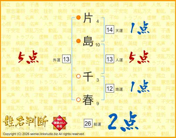 生活面を象徴する運勢です。外部から受ける影響力を表し、結婚運、家庭運や職場、環境への順応性を表します。総運から人運を引いた画数。姓や名が1文字の場合を除く。