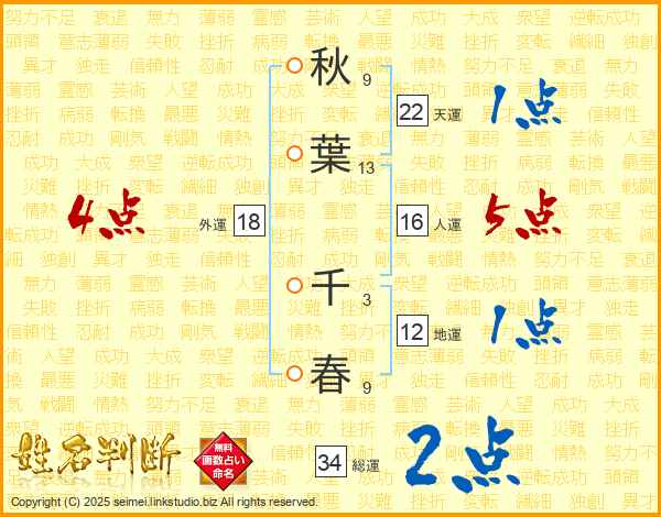 あなたの人生を表す1番重要な運勢です。生涯を通じて影響する総合運となり、主に50歳以降の晩年期に影響を及ぼします。苗字と名前の合計画数。