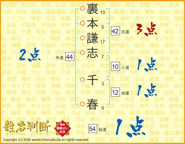裏(13画)本(5画)謙(17画)志(7画) 千(3画)春(9画)