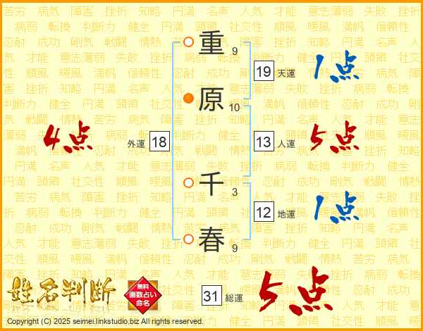 重原千春さんの総運は31画の5点!