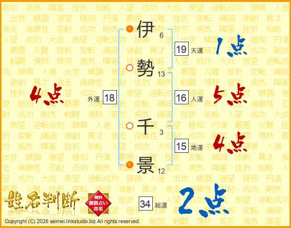 伊勢千景さんの総運は34画の2点!